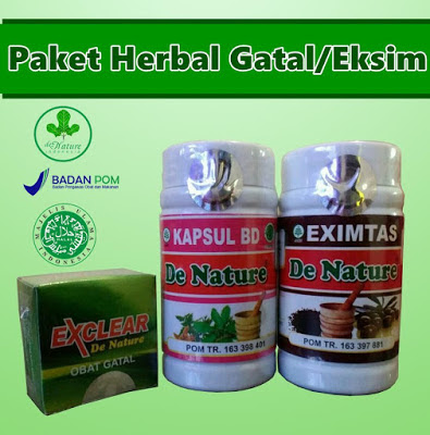 Salah satu Herbal untuk mengatasi penyakit gatal eksim adalah produk dari De nature Indonesia paket herbal gatal eksim Kapsul Eximtas dan Kapsul BD (bersih darah) De nature serta Salep Exclear, paket herbal untuk penyakit gatal eksim yang terbuat dari bahan alami dan aman di konsumsi karena terdaftar di BPOM